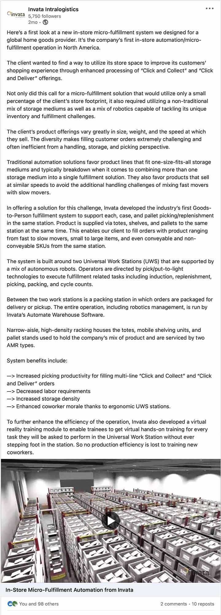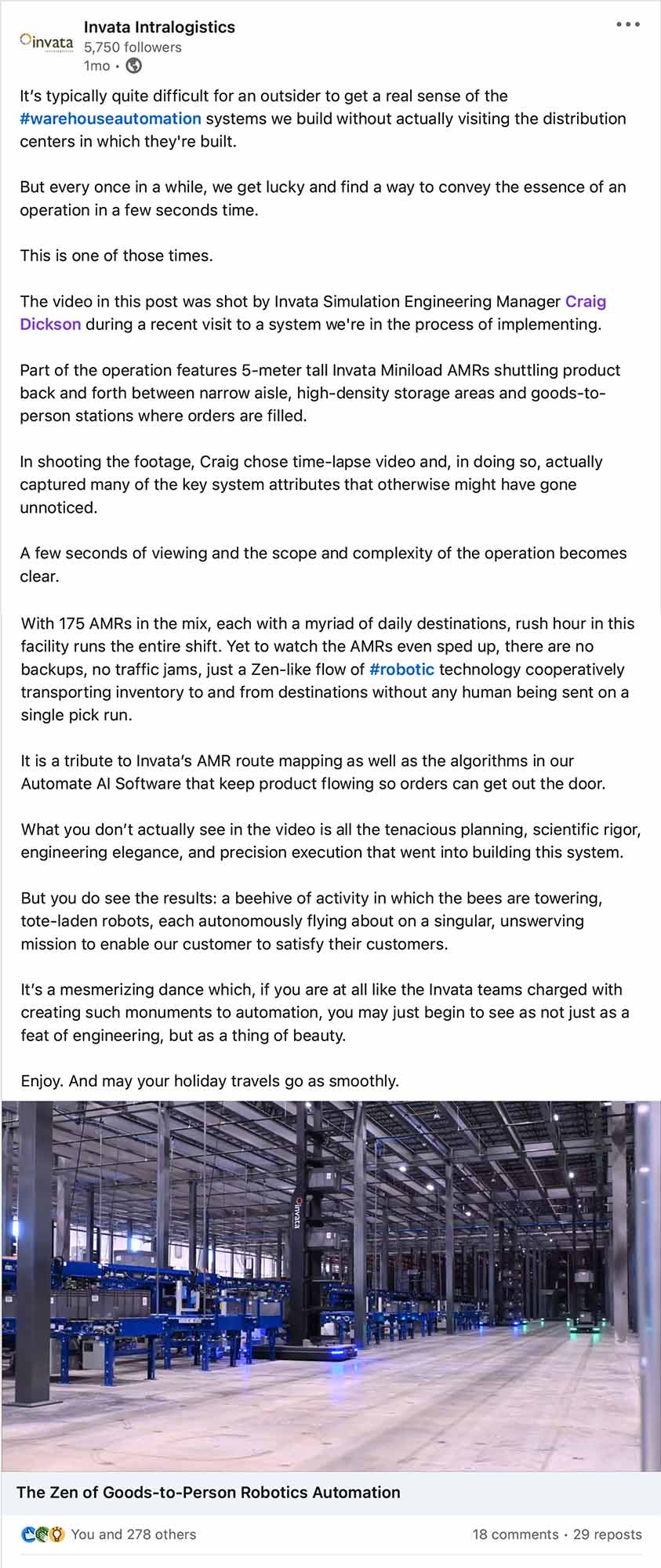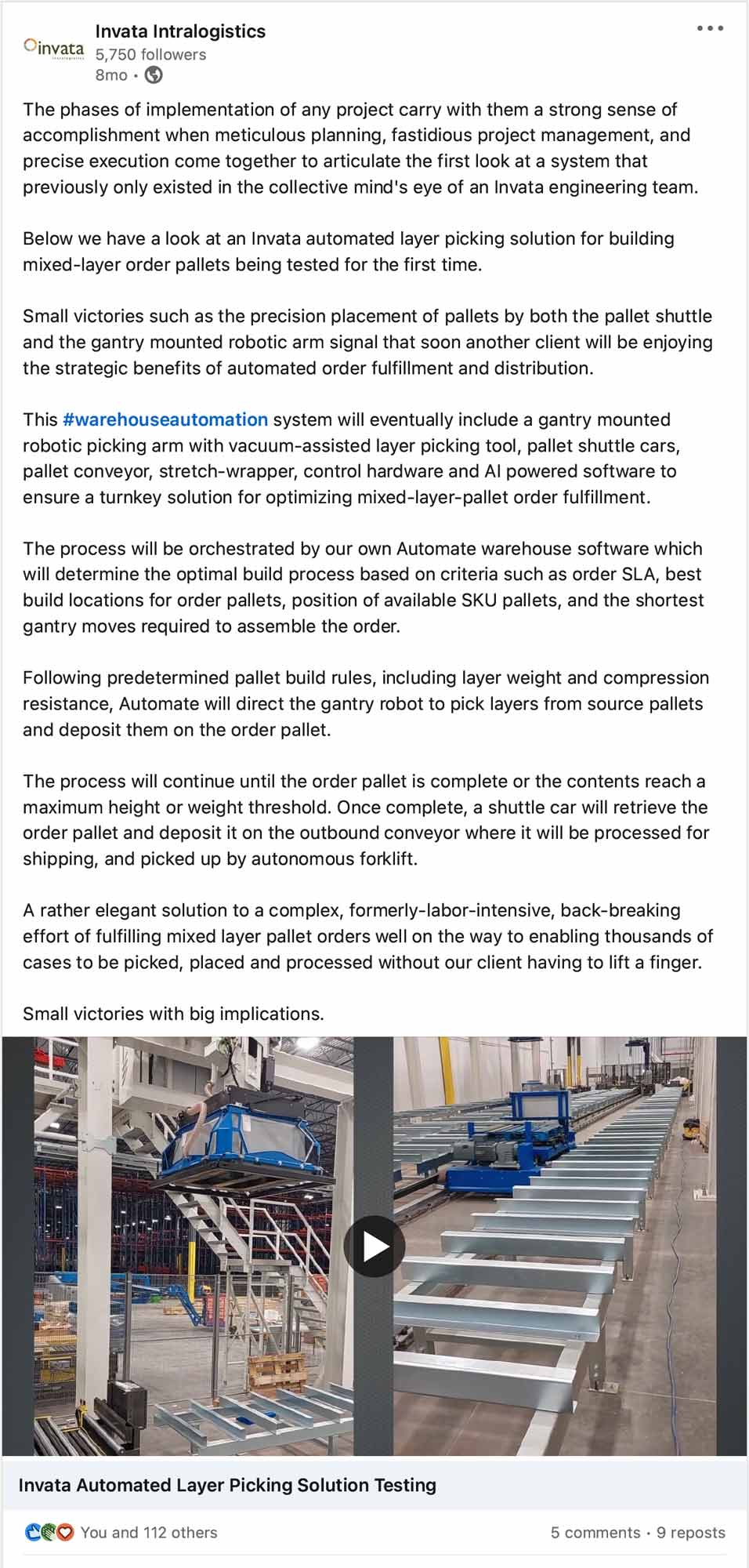 The LinkedIn posts in this gallery were created and written by Walter High for Invata Intralogistics. Click on any post to read or download.
